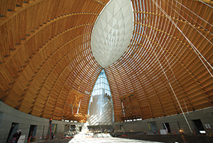 Because the framing is so unique and doesn’t follow any of the structural types listed in the 2001 California Building Code, the City of Oakland Building Department required the engineer of record to establish a peer review committee to help develop the requirements of this framing system. This peer review committee consisted of three university professors and an industry expert. The committee developed the criteria for the structure’s ductility and toughness to resist seismic activity. The building is designed to withstand a 1000-year seismic event. In addition to its magnificent outer beauty, the sanctuary also features two organ lofts built with curved glulam members.